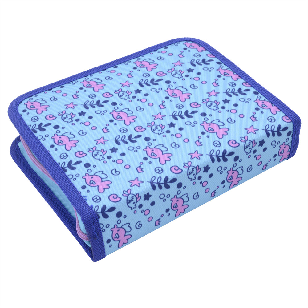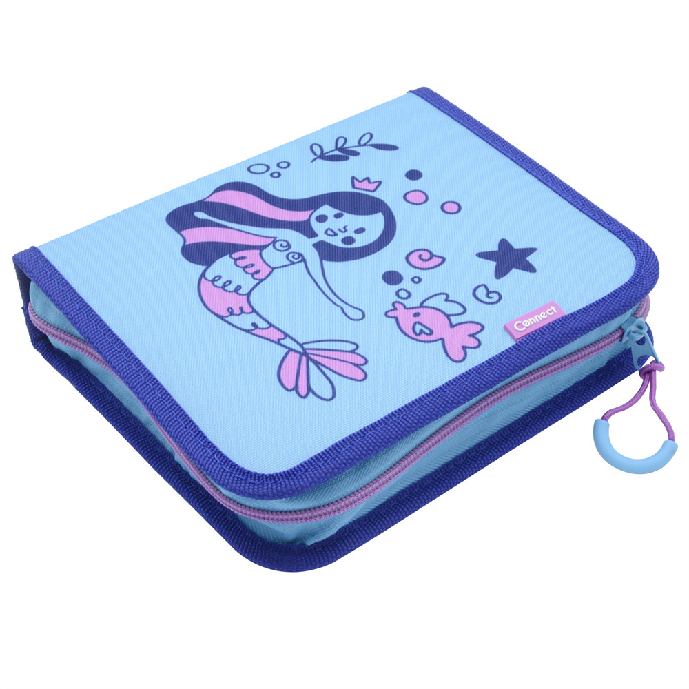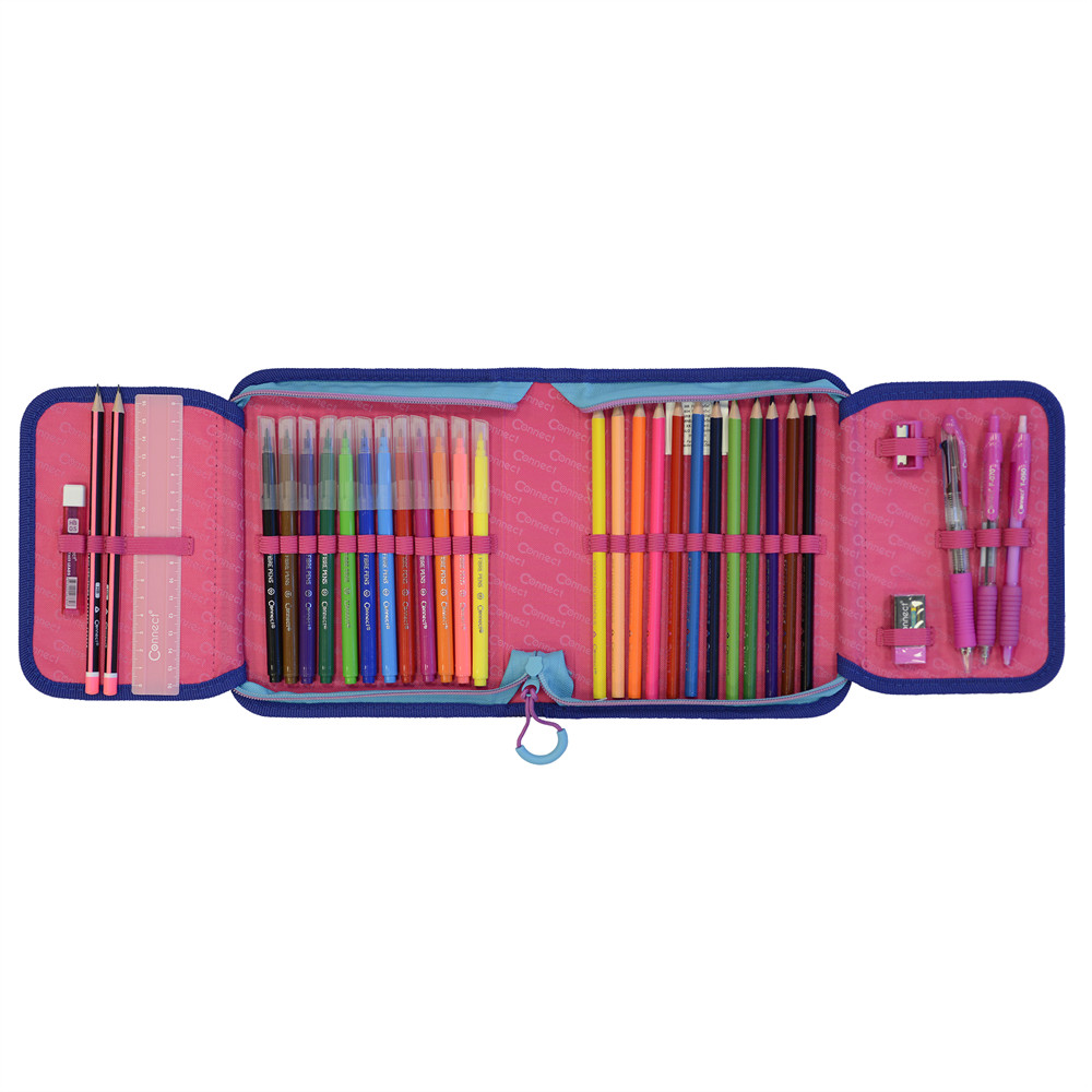 Egyrészes, írószerrel töltött,cipzáras tolltartó. Belül nyomott mintás textillel bevont merev lapokkal, gumis kialakítással az írószerek tárolásához. Katalóguskód: 34401