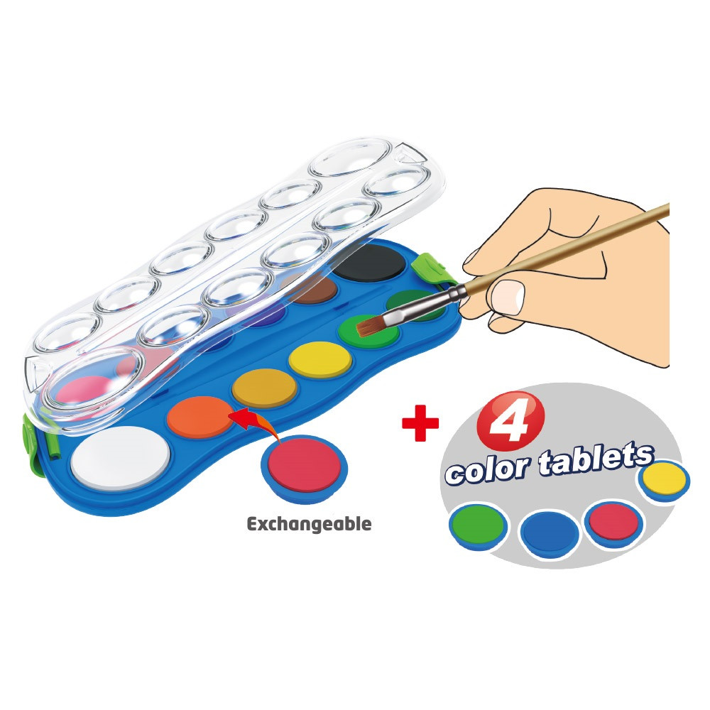 gazdag színválaszték, élénk színek, 12 különböző + 4 ajándék festékkorong, ami cserélhető és bepattintható a kifogyottak helyére
